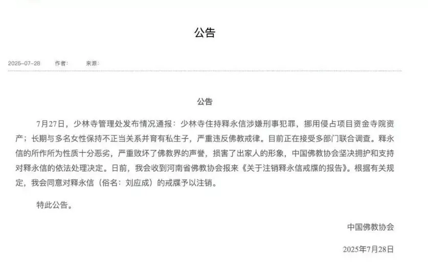 随后,中国佛教协会也发出了注销释永信戒牒的公告。
