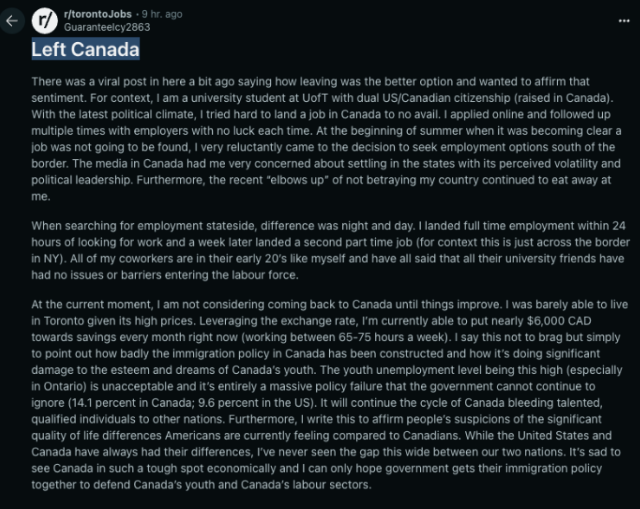 另外,我写这些也是想让大家知道,美国人和加拿大人目前在生活质量上的差异确实很大。虽然美加两国一直存在差异,但我从没见过两国差距像现在这么大。看到加拿大在经济上陷入如此困境,我心里很难过,只希望政府能调整移民政策,保护加拿大的年轻人和劳动力市场。