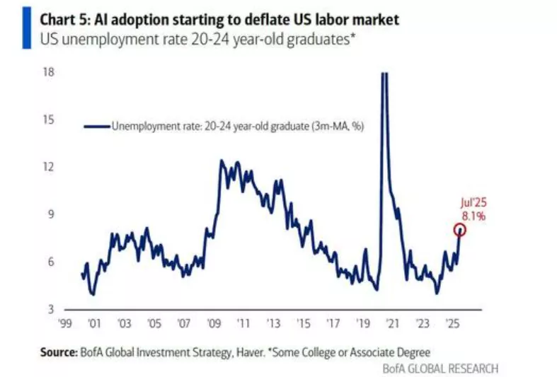 与此同时,AI对实体经济的影响已初步显现。报告引述数据称,美国大学毕业生的失业率已从2023年12月的4.0%飙升至8.1%,这可能预示着AI技术正在对劳动力市场产生颠覆性影响。