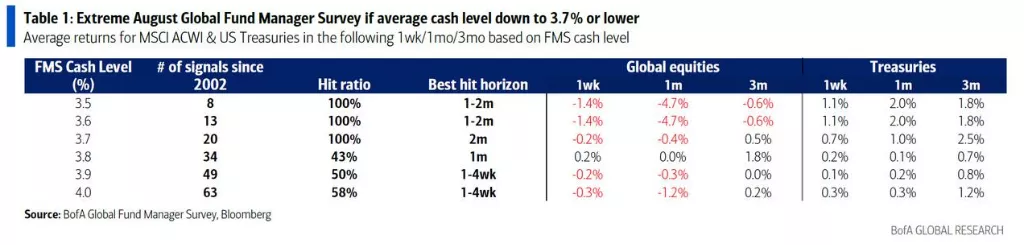 投资者现金水平从3.9%进一步下降。报告特别指出,历史上现金水平低于3.7%的情况出现过20次,每一次都伴随着未来1-3个月内股市下跌、美债跑赢大盘。