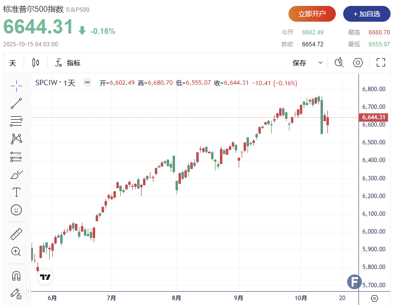 标普500指数收跌 0.16%,报6,644.31点。该指数盘中一度下挫1.5%,随后强力反弹转涨0.4%,但在尾盘再度跳水。