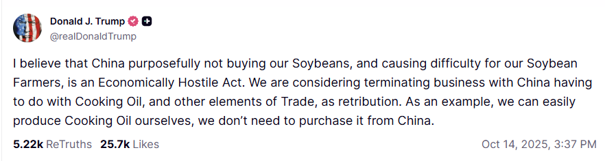 但川普周二晚些时候在其社交平台Truth Social上发文,指责中国“不购买美国大豆,是一种‘经济敌对行为(economically hostile act)’”,并威胁考虑实施食用油出口禁令(cooking oil embargo)作为报复。消息一出,三大股指迅速回吐涨幅,标普500最终收跌。