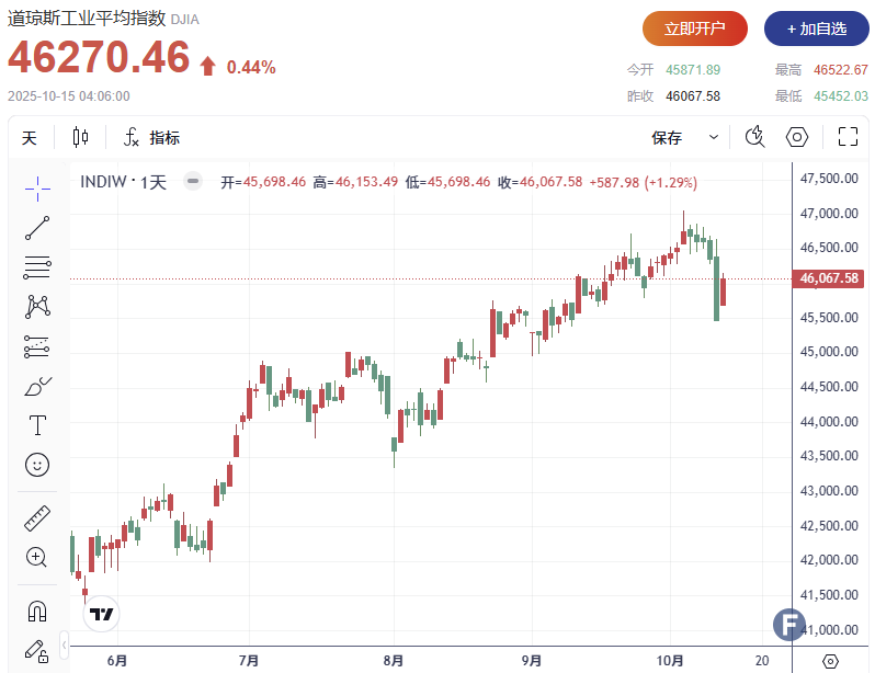 纳斯达克综合指数下跌 0.8%,收于22,521.70点,盘中最大跌幅一度达2.1%。道琼斯工业平均指数则逆势小涨 0.44%(+202.88点),收报46,270.46点,盘中一度上涨近1%,早盘则一度下跌1.3%。