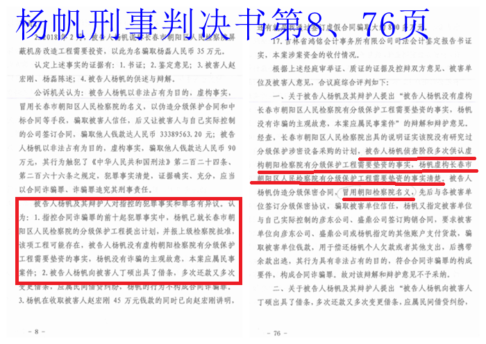 长春市中级法院(2019)吉01刑初68号刑事判决书记载:“被告人杨帆及其辩护人对指控的犯罪事实和罪名有异议。认为:1.指控合同诈骗罪的前十起犯罪事实中,杨帆已就长春市朝阳区人民检察院的分级保护工程提出计划,并报上级检察院批准,该项工程可能存在,被告人杨帆没有虚构朝阳检察院有分级保护工程需要垫资的事实,杨帆没有诈骗的主观故意,本案应属民事案件......”
