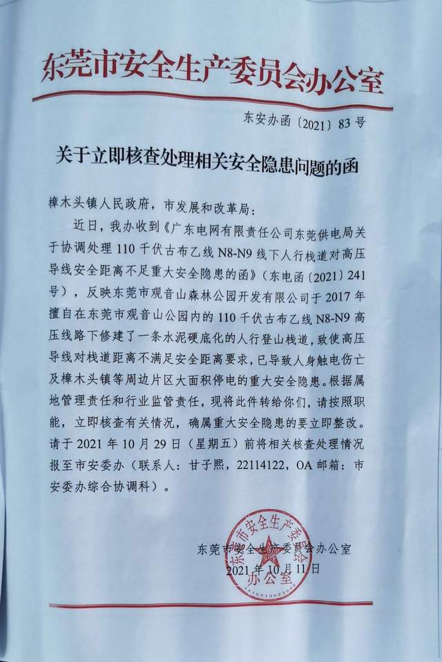 本来,东莞市供电局应该是一个为百姓为企业“发光”的国企单位,这次却完全一条道走到黑,再一次展开了疯狂报复。2021年9月28——10月11日,供电部门连续十几天里,向当地政府、安委、应急近10个部门发函称:因观音山擅自修建人行栈道,致使高压线不满足安全距离,导致已有人触电身亡和大规模停电。