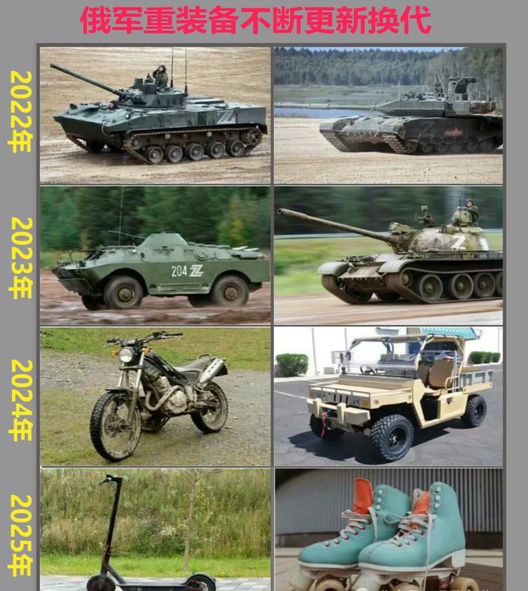 呵呵,现在已经没必要讨论俄式武器的实际质量问题,两年战争让俄军损失上万辆装甲车,而“越打越有钱”的经济又无法进行有效补充……于是,乌俄战场上出现了搞笑的一幕,俄军居然用高尔夫球车当运兵车。