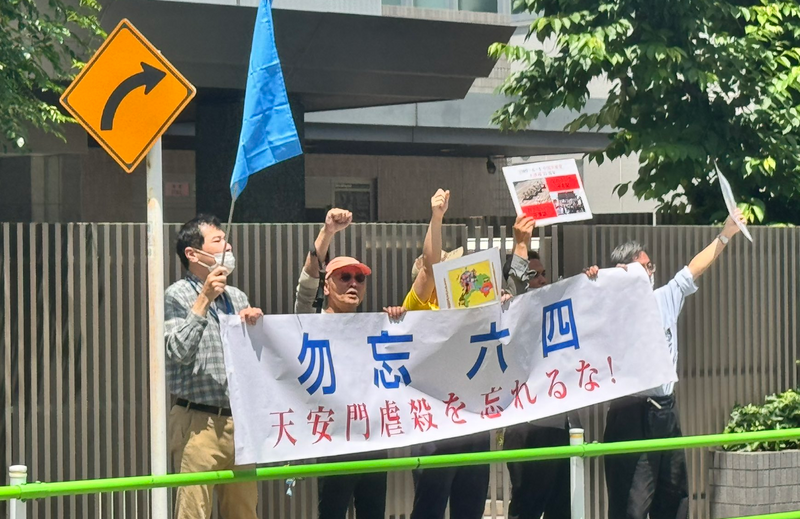 人权观察指出,中共当局对旅居日本的中国异议人士进行「跨境镇压」。图为今年六四前夕,在日中国人、台湾人、日本人、蒙古人在中国驻日大使馆外抗议。(图撷自@spinel_jp99「X」帐号)