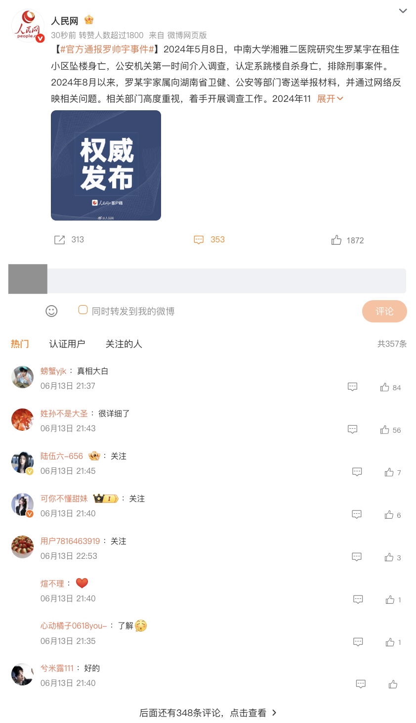 微博部分官媒针对罗帅宇事件控评,以下为央视新闻和人民网相关微博评论区对比: