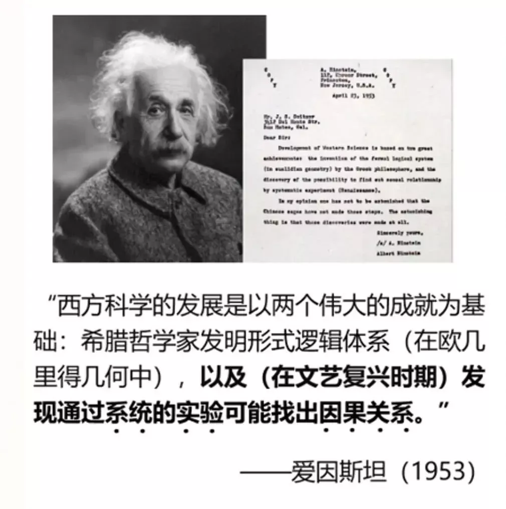 爱因斯坦的话出自他于1953年写给朋友的一封信,“西方科学的发展是以两个伟大成就为基础:希腊哲学家发明形式逻辑体系(在欧几里得几何中),以及(在文艺复兴时期)发现通过系统的实验可能找出因果关系。在我看来,中国贤哲没有走上这两步是用不着惊奇的,做出这些发现是令人惊奇的”。