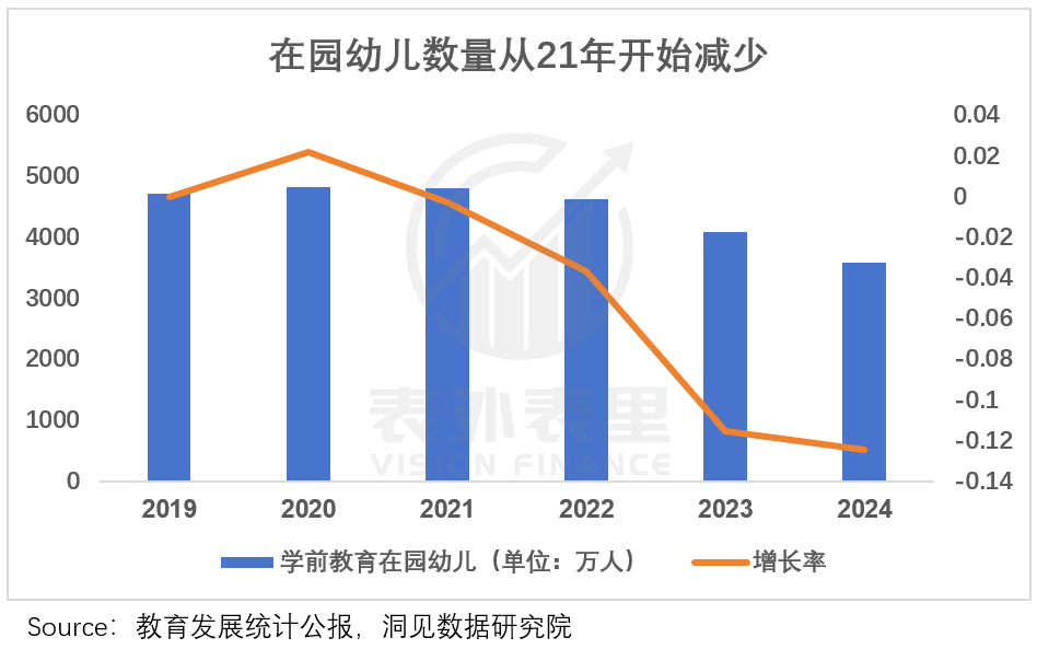 屋漏偏逢连夜雨,幼教行业的“达摩克利斯之剑”也在这时落了下来——“少子化”浪潮,在2021年波及幼儿园,此后在园人数逐年递减。