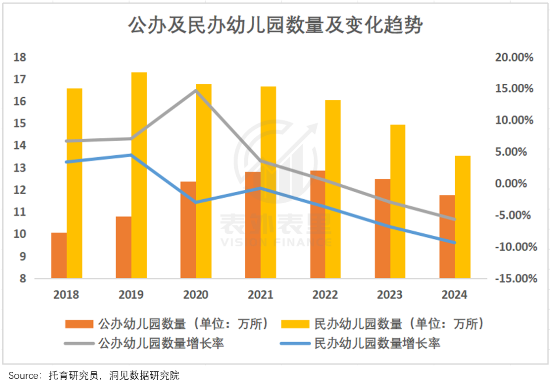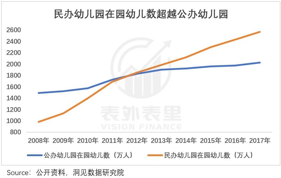 可以看到,民办幼儿园在园人数不仅超过公办成为学前教育主体,每年仍以不小的增长狂奔。