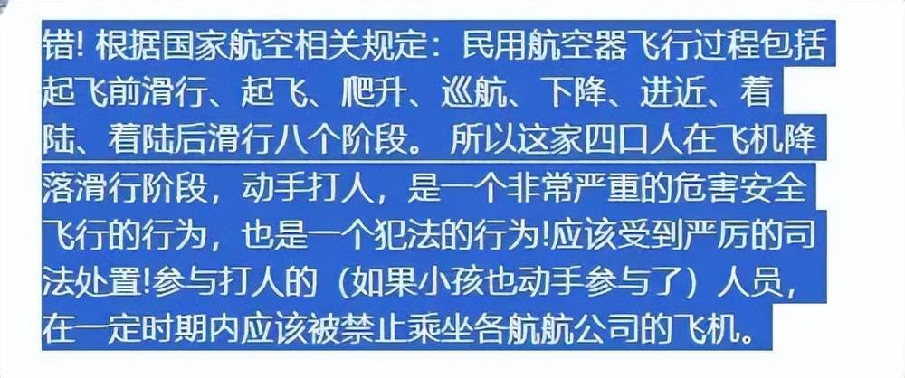 有的网友认为:这家人在飞机上的所作所为本就是危害安全飞行的行为,而且这种扰乱纪律参与打人的人员,在一定时期内应该被禁止乘坐各航航公司的飞机。