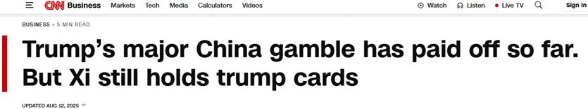 CNN文章最后写道,因此,习近平正在等待时机,利用中国的资源和出口优势。面对几乎用关税碾压所有外国领导人的美国总统,这无疑是一张好牌。