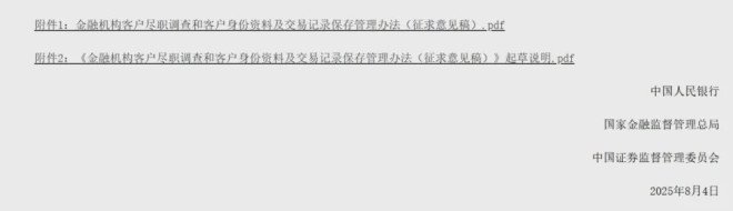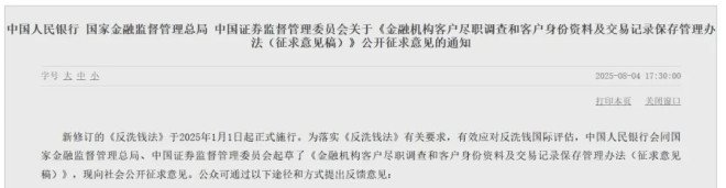 2025年8月4日,中国人民银行、国家金融监督管理总局、中国证监会联合发布《金融机构客户尽职调查和客户身份资料及交易记录保存管理办法(征求意见稿)》,面向社会公开征求意见,截止日期为2025年9月3日。