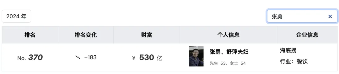 受此影响,海底捞创始人张勇夫妇身价也出现了大幅下滑。根据2024年胡润全球富豪榜显示,张勇夫妇以530亿元的身价全球排名第370名,较去年下降183名;值得注意,2021年,张勇夫妇曾以2450亿身价位列全球第38名。也就是说,仅三年时间张勇夫妇身价就蒸发了1920亿。