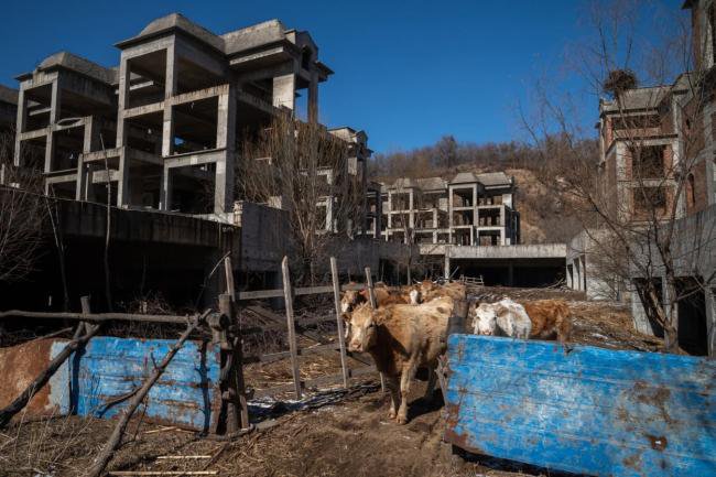 沈阳郊区,牛群在“绿地国宾府”未完工的建筑附近徘徊。该项目的销售处已荒废。图片来源:ANDREA VERDELLI/BLOOMBERG (TOP), JADE GAO/AFP/GETTY IMAGES