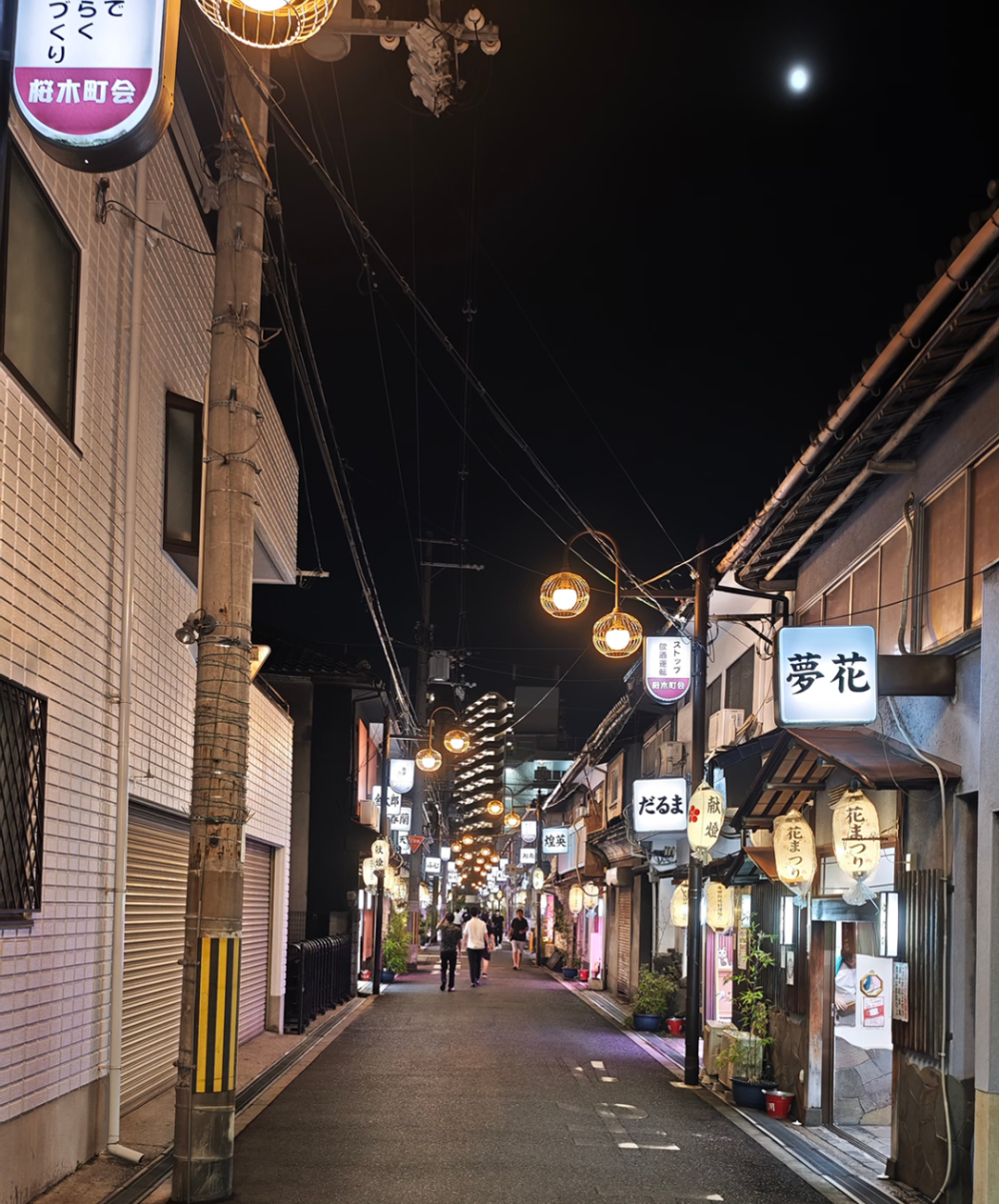 但“大开眼界”的旅途还没完成。“女体盛”过后,紧接着,所有人便在导游的带领下,来到了“飞田新地”。这是大阪的一条街,也是日本著名的“红灯区”,白天时,道路两侧房屋紧锁,但是一到夜晚,随着灯光接连亮起,街道变得格外热闹。屋檐下的灯笼散发出奶黄色的光芒,一扇扇大门也随之敞开,每一个门内都有一个精心打扮的年轻女孩子,或是跪坐,或是侧卧,在美妆灯的照射下,像一个又一个芭比娃娃,正对着过往行人展露笑容。