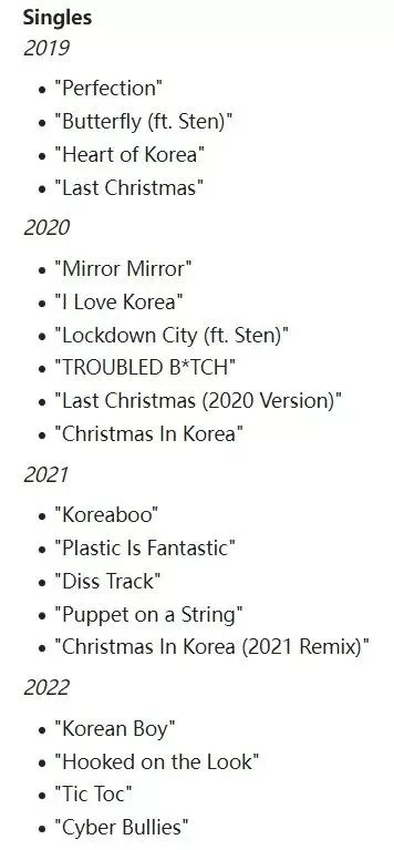 自2019年以来,他几乎每年都会发几首单曲,而且因为他本人的话题度颇高,让他真的有几首歌在Youtube上达到了千万播放。