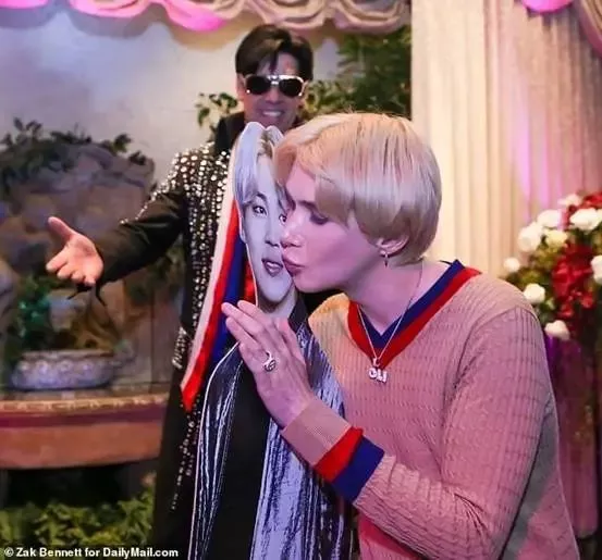 当时他还有个大自己十来岁的女友,但这也阻止不了他对朴智旻的热爱,在猫王模仿者的见证下,他嫁给了自己偶像的立牌。