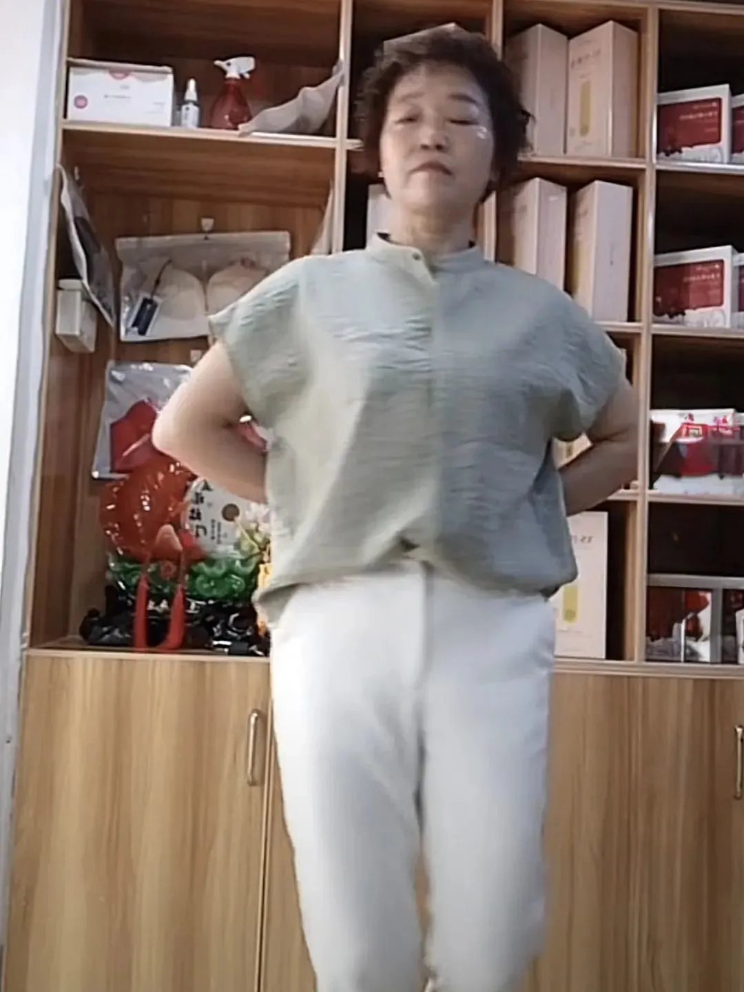 胡友平的店就租在隔壁小区,是一间七八平米的门头房。她给自己的店取名“DM时尚”,定制了整墙木色格子柜,精心摆放代理的“时尚女性消费品”:从内衣、代餐到化妆品、美容保健品。客人寥寥,有时她一天在店里能发三条短视频,比如2020年5月28日,她穿着中式领子的豆绿色短袖上衣,白裤子搭配白色皮凉鞋,双手背后,伴着音乐颇有兴致地跳了一段“慢三步”,又假装了然无趣地写道:“一个人跳慢三步丑死了。”