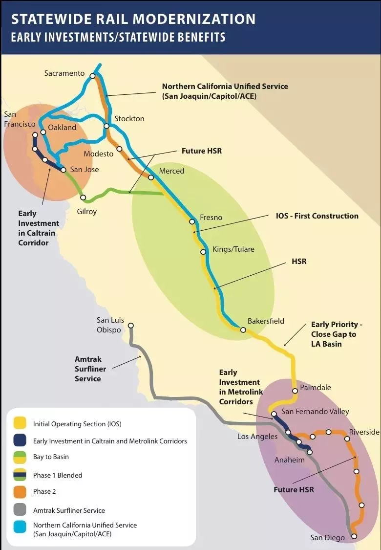 加州高铁曾经承载了加州美好的梦想,以“Y”字型的结构,北接旧金山和加州首府萨克拉门托,南至洛杉矶,并延长至圣地亚哥,全场776英里,另外还有东线的拉斯维加斯到洛杉矶的高铁沿线。