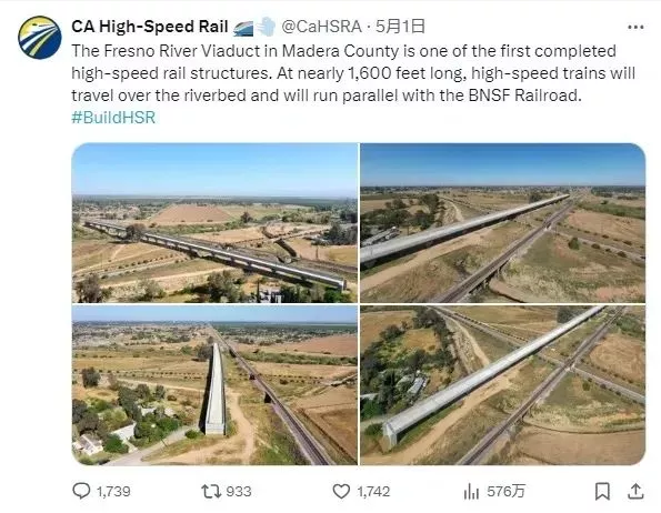 去年5月,加州高铁局发文庆祝:位于马德拉县(Madera County)的弗雷斯诺河高架桥(Fresno River