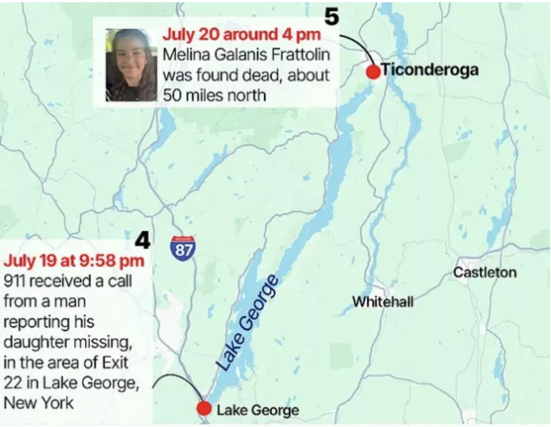 7月20日清晨,警方在上州蒂康德罗加(Ticonderoga)靠近佛蒙特州边界搜查。上午11点左右,纽约州警方在附近的池塘浅水区发现了小女孩的遗体。