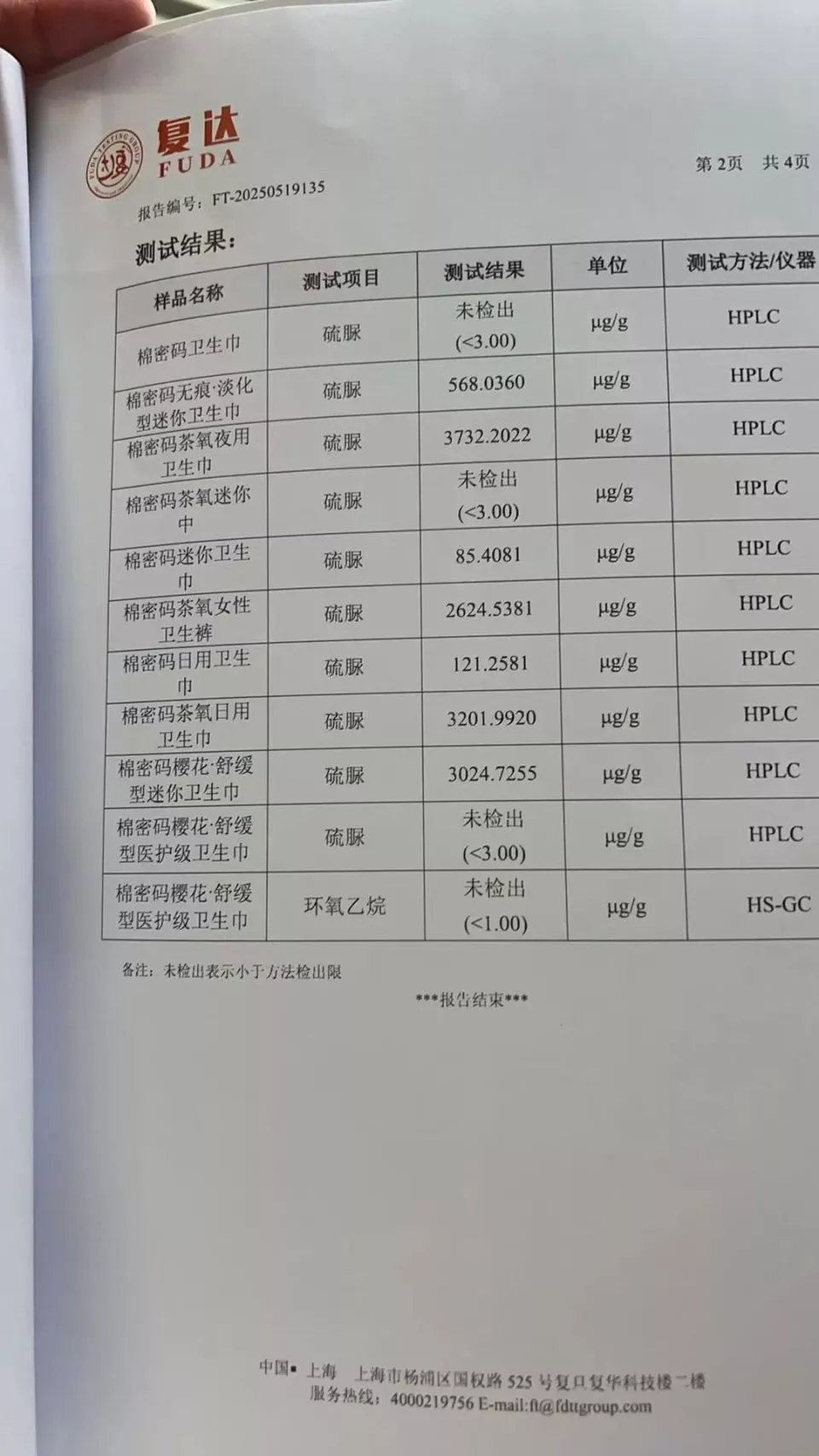 今年5月,王先生在自媒体上曝光“棉密码”卫生巾添加硫脲,并组织消费者集体送检。上海复达检测技术集团有限公司出具的检测结果显示,10份样品中有7份检出硫脲,其中棉密码茶氧夜用卫生巾、棉密码茶氧日用卫生巾、棉密码樱花·舒缓型迷你卫生巾的硫脲含量分别高达3732.2022μg/g、3201.9902μg/g、3204.7255μg/g。