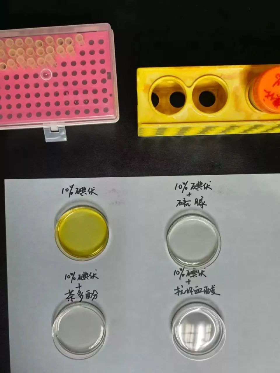 ▲碘伏溶液与相同浓度的硫脲、茶多酚与抗坏血酸(俗称维生素C)进行反应实验,静置3小时后的褪色效果对比。受访者供图