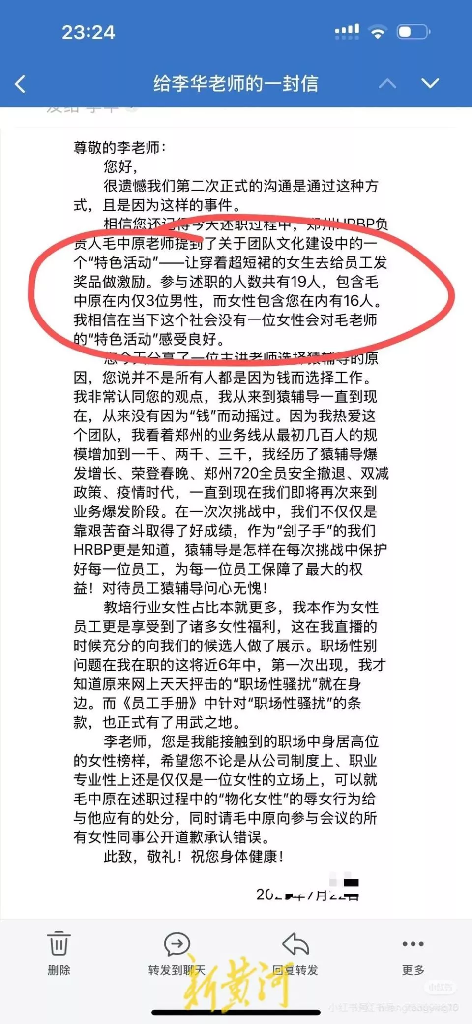 该员工透露,7月22号下午参加年终述职活动,其听到穿超短裙发奖品的企业文化活动设想,当晚向公司发布邮件,表明态度和观点,猿辅导人力资源总监李华也进行了回复。