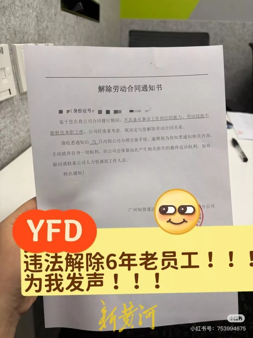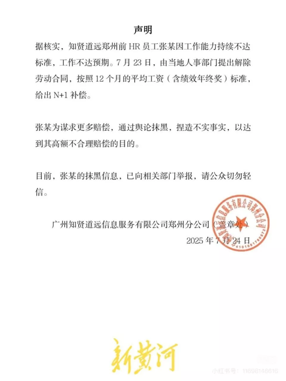 7月24日,猿辅导招聘小红书账号发文称(主体全称北京猿辅导线上学科培训学校),据核实,智贤道远郑州前HR员工张某因工作能力持续不达标准,工作不达预期,7月23日,由当地人事部门提出解除劳动合同,按照12个月的平均工资(含绩效年终奖)标准,给出N+1补偿。