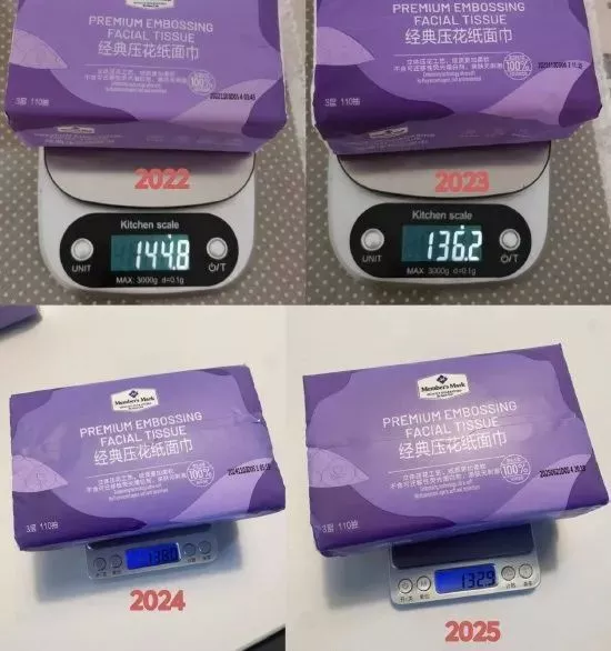 有山姆会员反馈称,自己多年来一直使用的山姆紫色抽纸,虽然价格未变,但纸张变得又薄又软。经称重发现,2024年和2025年的同款抽纸重量从138g/包下降到了132.9g/包。