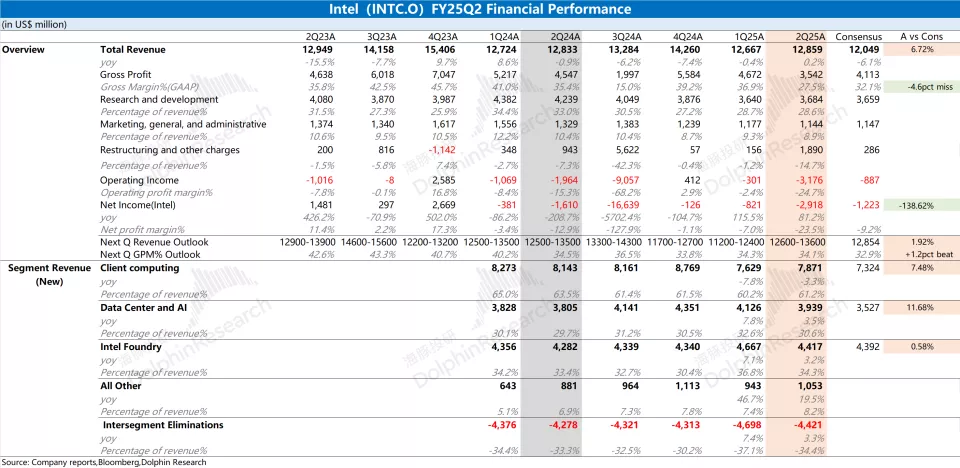 英特尔于北京时间2025年7月25日上午的美股盘后发布了2025年第二季度财报(截止2025年6月),要点如下: