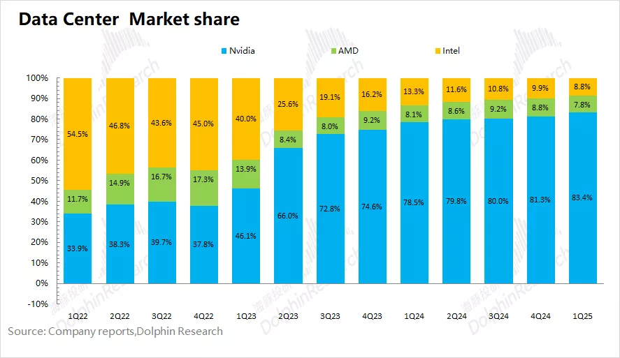 4、下季度指引:英特尔预期公司2025年第三季度营收为126-136亿美元,区间中值环比增长1.8%,与市场预期相近;2025年第三季度毛利率为34.1%,依旧维持在相对低位,略好于市场预期(32.9%)。