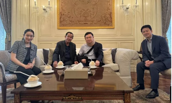 2024年3月,洪森(左二)赴泰国探望刚获假释的他信(左三),贝东丹(左一)也在场。 图 :
