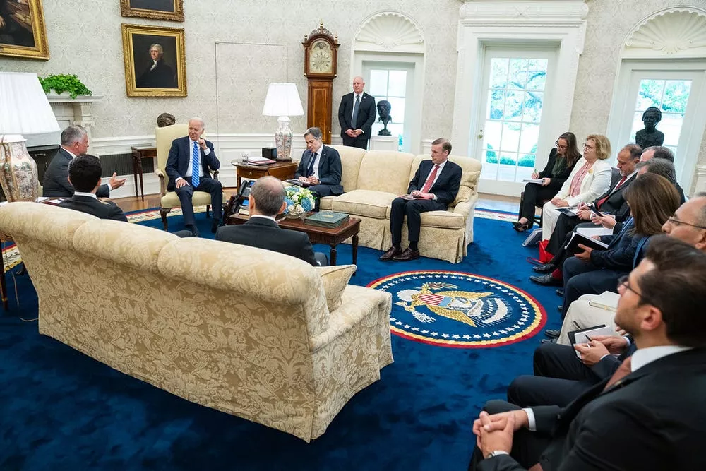 拜登的蓝色椭圆办公室地毯,其实是克林顿时代就定制的,图案有总统印章和橄榄枝,象征和平