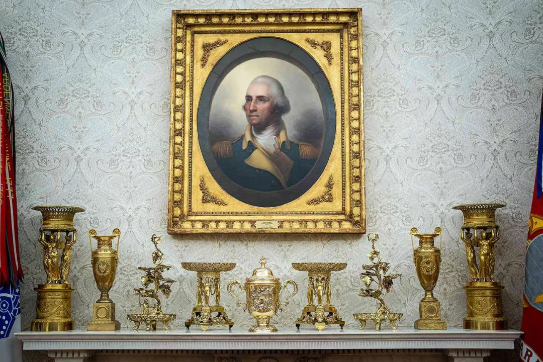 你进去看一眼:壁炉上是金色浮雕装饰,镜子镶着金边,甜点架、花瓶都来自18、19世纪的伦敦和巴黎。墙上密密麻麻挂着前总统画像,统一标配:超浮夸金框...