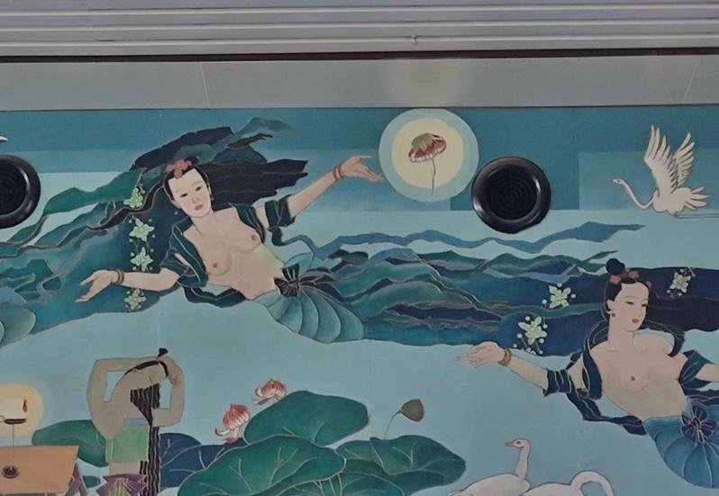 新闻晨报报道,一名女子称出差在太原车站等车,偶然擡头就看到了上面的壁画,但她愈看愈不对劲,用相机放大才看清楚,壁画上面的女性,都没有穿着上衣,胸部裸露在外面,她认为不妥当。