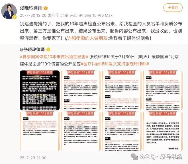对于爱康的起诉,张晓玲律师展现出法律专业人士的强硬姿态。她通过微博公开喊话:关于媒体见面会的10个谎言的公开回应。称“别遮遮掩掩的了,把我的10年超声检查公布出来、给我检查的人员名单和资质公布出来、第三方是谁公布出来、结果公布出来,起诉内容公布出来,我没收到,也别整假患者、伪专家了!”