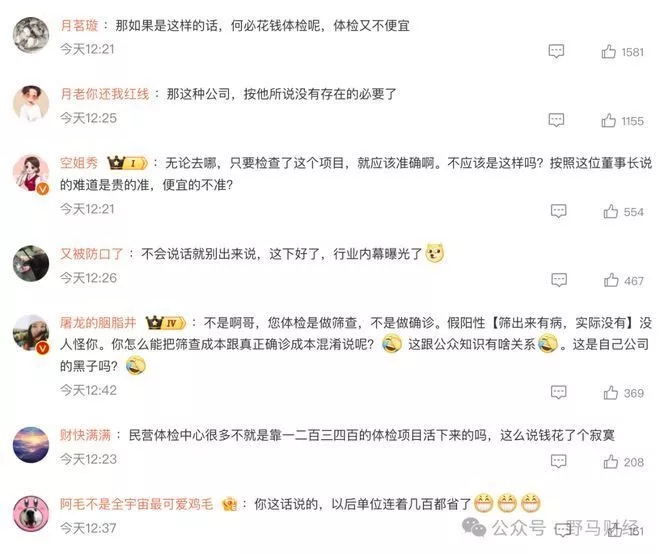 舆论一时哗然,有网友认为“那如果是这样的话,何必花钱体检呢,体检又不便宜。”“那这种公司,按他所说没有存在的必要了”。还有网友表示“无论去哪,只要检查了这个项目,就应该准确啊。不应该是这样吗?”“不会说话就别出来说,这下好了,行业内幕曝光了”“民营体检中心很多不就是靠一二百三四百的体检项目活下来的吗,这么说钱花了个寂寞”。