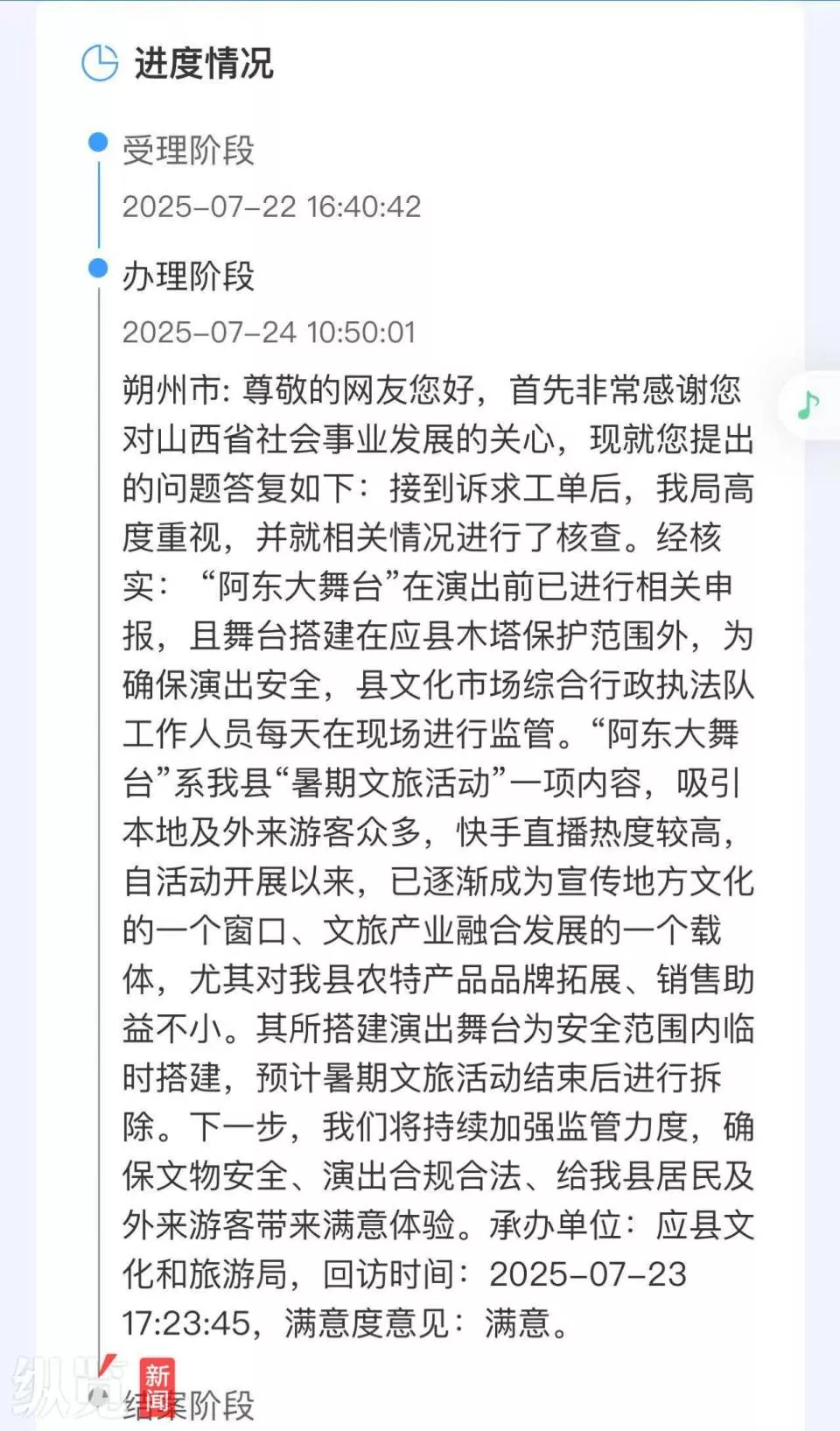在网络上未得到回应后,刘华伟通过12345市民热线进行了投诉。7月24日,应县文化和旅游局(下称应县文旅局)进行了回复。刘华伟说,他看了回复后,认为回复避重就轻,没有给出合理、科学的依据,也没有出示任何“阿东大舞台”的审批文件。让他感觉可笑的是,他没有接到回访电话,却显示投诉人“满意”。于是,他又向上级部门进行了投诉,目前还没有得到答复。