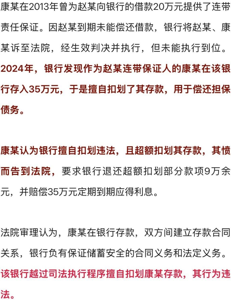 “2024年,康某在银行存款35万元用于儿子结婚,谁料取款时,竟发现账户余额为0,经询问,原来是银行擅自扣划了康某的存款,用于偿还其作为连带保证人的债务。”南通如东县人民法院民二庭法官助理倪静静介绍。