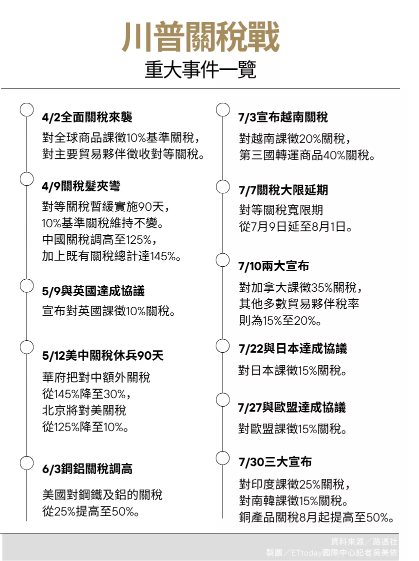 美国总统川普2.0关税战的对等关税宽限期将于8月1日到期,他31日宣布,已与墨西哥总统薛恩鲍姆(Claudia Sheinbaum)达成协议,将对部分墨西哥进口商品征收25%关税的措施延长90天,原本“关税通知函”预告提高至30%的新关税,则至少延后3个月实施。