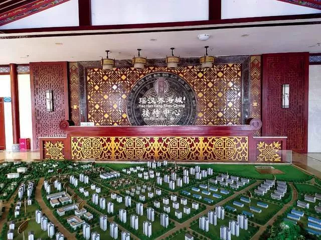 瑶汉养寿城接待中心空空如也,从现场的沙盘可以感受到项目的庞大。