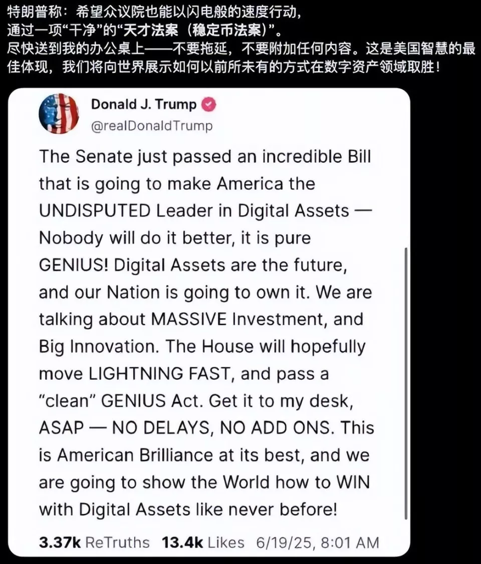 就比如,现在要求合规的美元稳定币发行商,必须把大部分储备金拿去买美国国债。目前稳定币市场几千亿,以后要是几万亿,那得给美债带来多大的新买家?这就能帮美国政府以更低的成本发债。