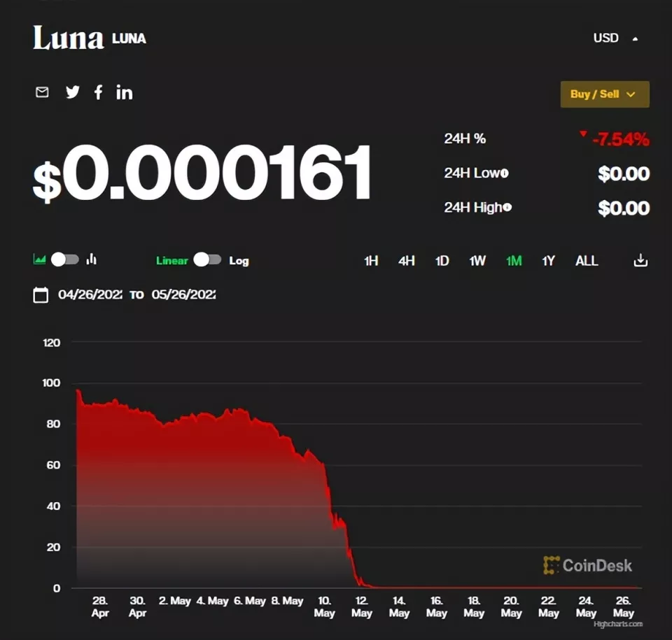 2022年,就有个很有名的算法稳定币,叫Terra/Luna,本来运行的还行,但遇到市场极端抛售的时候,他的算法也顶不住了,直接崩盘,短短几天内蒸发了数百亿美元,买了这个币的人就直接财富归零了。