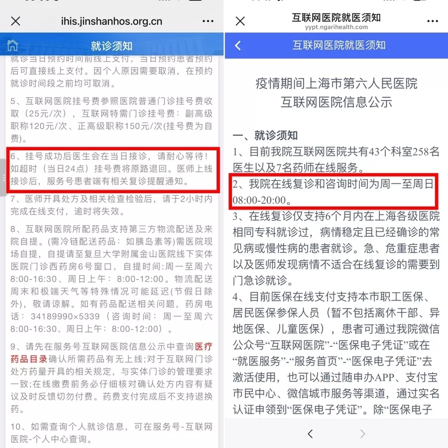 打开各个互联网医院界面可发现,线下难抢的专家号竟变得充裕,给了患者一种随时预约问诊的“错觉”,但界面上,医生的接诊时间都不会明示。比如在金山医院的“在线就诊”功能中,挂号的科目列表内医生名片显示的是好评率和问诊量。在医院不太明显的一份就诊须知中提到,挂号成功后医生会在当日接诊。如医生未接诊,于当日23时前自动退还挂号费。又如在第六人民医院的“在线复诊”入口中,医生名片也会显示评分和复诊量。但就诊须知似乎还停留在多年前,提及“我院在线复诊和咨询时间为周一至周日8时至20时”,未说明医生的接诊时限。