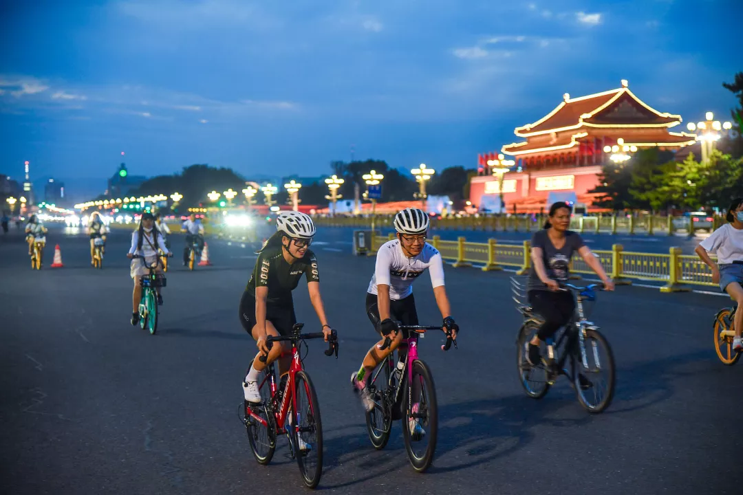 ●?北京,傍晚日落时分,不少市民和游客在长安街上骑车经过天安门广场