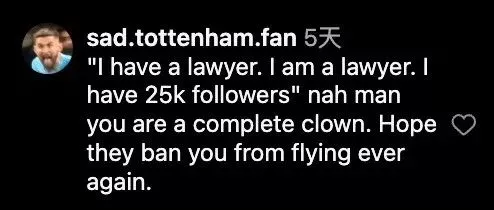 “‘我有律师,我就是律师。我有2.5万粉’…哥们,你完全是个小丑。希望他们以后禁止你坐飞机。”