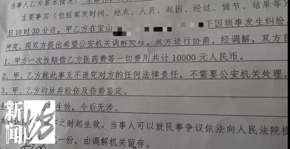 当天,警方前来处理纠纷,就打人事宜楼上业主赔付沈女士家1万元。
